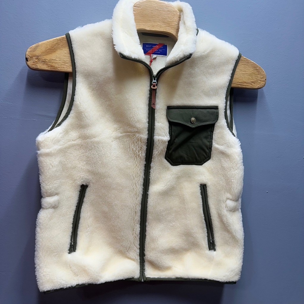 Best Made Co Mens Wool Fleece Vest Cream Olive Green Full Zip Made in Canada